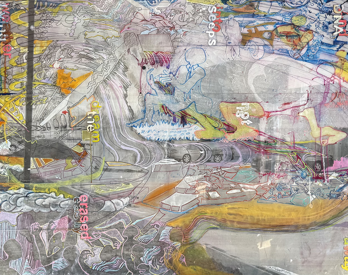 Acrylic inks photocopy oil paint salvaged perspex watercolour paper